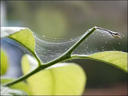 Если дело запущено капитально, может доходить до курьезов: лист становится полностью блестящим от паутины, как зеркало, а на конце листа повисает капля из колоний этих клещей. Красная или желтовато-бежевая. Кроме белесых шкурок лист на том месте, где клещ вредит, сверху эта листовая пластина покрывается мелкими либо сухими, либо желтоватыми вначале пятнами. Если не проводить обработки от паутинного клеща, в дальнейшем на листьях появляется краевой некроз — уже идет нарушение метаболизма, края закручиваются вниз, а сами листья становятся хрупкими.