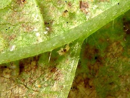В большом скоплении клещи выглядят как слой пыли. Связано это с тем, что обыкновенный паутинный клещ живет преимущественно с обратной стороны листа, и паутинку плетет между жилками, если присмотреться ее можно увидеть с помощью лупы вдоль центральной жилки. Но если ничего не обнаружили, это не значит, что клещей нет.