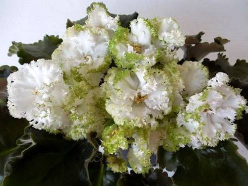 Цветы крупные, пушистые, полумахровые и махровые, белого цвета с густой гофрированной зелёной рюшкой.
