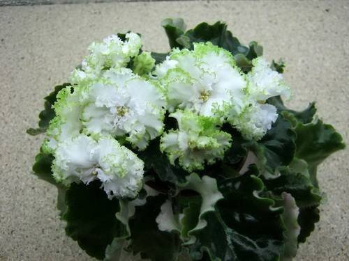 Листья ярко-зелёные, сильно волнистые, довольно крупные, обнимают горшок. Стандарт. Розетка хорошо формируется, мне понравилось, как листики раскладываются, нет повышенной скученности как у многих кучерявых листьев.