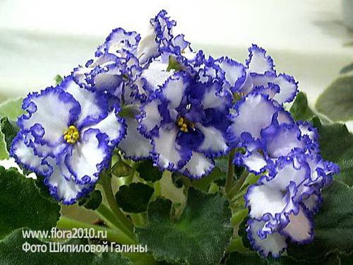 Махровые белые цветы с четкой карандашной синей каймой. Цветет всегда большим букетом, но по-разному.