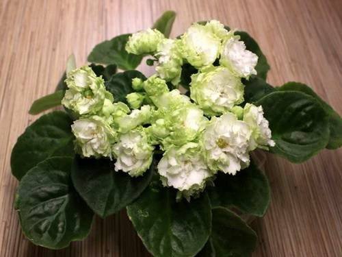 Сорт неприхотлив и очень долго держит цветы. Цветы не очень крупные, средние, сантиметра 3-4. Цветы очень махровые, этот сорт просто усыпан цветками, формируют цветы-шарики с широким зелёным гофрированным краем. Цветы раскрываются зелёными, затем белеют. Цвет лепестков светло-зеленый скорее, чем белый.