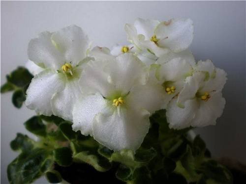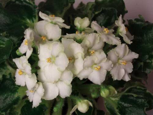 Цветочки простые белые с мелкобахромчатым краем и тонкой зеленой каймой расположены на крепких цветоносах и красивым букетиком располагаются над розеткой. Серединка цветка тоже зелено-желтая. По краям лепестков — тонкая бахрома, которая еще больше украшает цветочки. Зеленоватая кайма особенно хорошо проявляется при невысокой температуре.