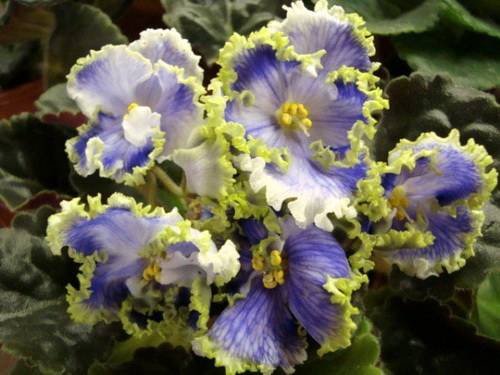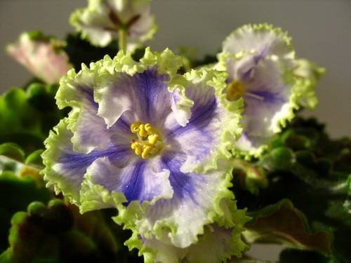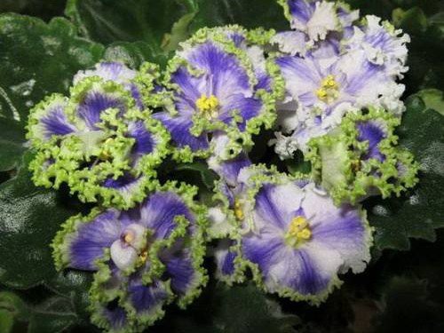 Вариабельный бело-голубой окрас + яркая бело-зеленая густая рюша. Необычная фиалка с рюшей проявляющейся даже при очень теплом содержании.