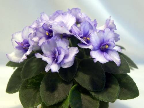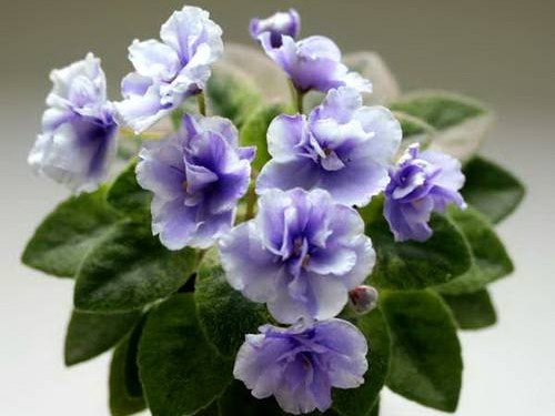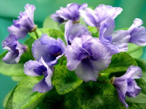 Обильное и продолжительное цветение, примерно с месяц. Цветет редко – не более двух раз в год. Крупные голубые цветы расположены красивым веночком. У нее короткие цветоносы, цветы прячет под листьями, если и вылезают из-под листвы, то так и остаются торчать между листьев — это особенность сорта. В жаркое время белого на цветочке мало. Этот сорт склонен к затемнению, за два-три года розетка затемняется.