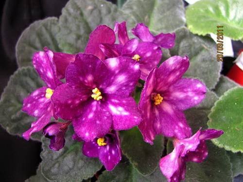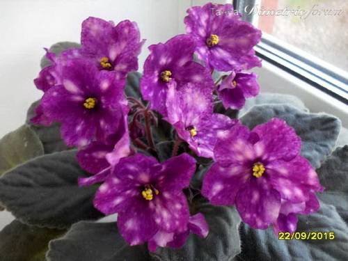 Обильное цветение на устойчивых цветоносах. Большой шапкой не цветет. Цветы у этой фиалки держатся месяц. У этого сорта особенность — когда цветы только распустились — они более насыщенного тёмно-лилового цвета, крапины фэнтези небольшие. Когда цветок полностью распустился — цвет становится менее интенсивным, а пятна фэнтези больше и расплывчатые. Цветочки со временем выгорают и тускнеют.