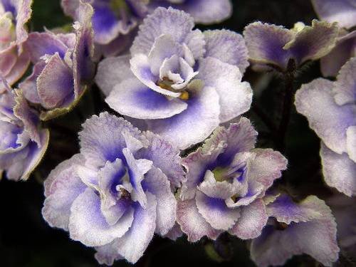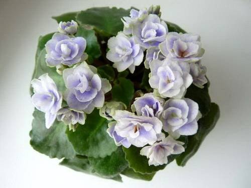 Светлые нежно-сиреневые махровые оборчатые цветки с бледно-голубой заливкой на нижних лепестках, синим глазком и светло-голубой сеточкой на верхних лепестках. Поближе становится видна сложная восхитительная венозная сеточка, которая, кстати, ближе к сиреневому, чем к голубому.