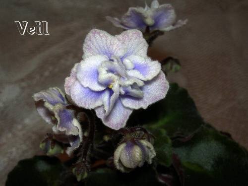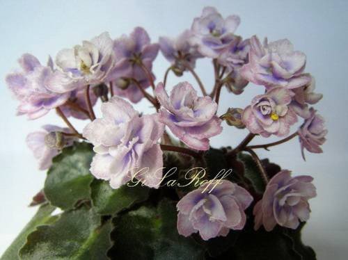 Полуминиатюра. Махровые серебристо-сиреневые анютки с темно-синим основанием лепестков украшены сеточкой черничных прожилок. Сорт на любителя.