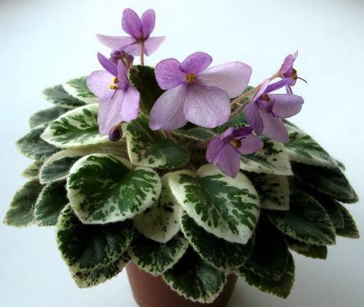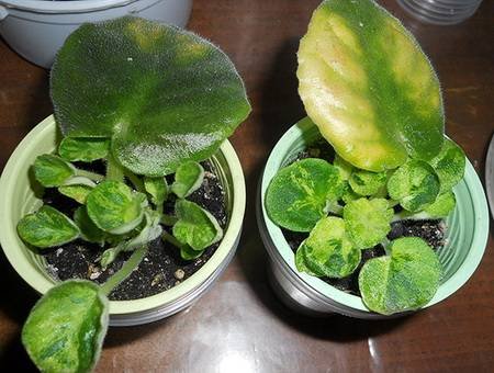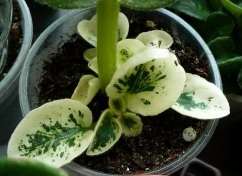 Так же есть отличия в посадке черенков пестролистных фиалок. Количество пестроты не передаётся потомству. Из совершенно зелёного листа могут появиться практически белые детки и наоборот. Для размножения пестролистных фиалок не рекомендуется использовать старые или слишком молодые листья. При размножении пестролистных сортов используют черенки из второго ряда листьев, так молодые и сильные листья укоренятся и размножатся легче, чем старые.