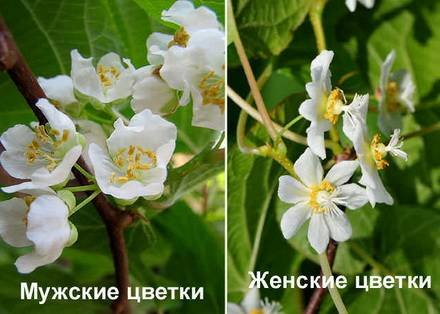 Мужская актинидия отличается тем, что у ее цветков, при наличии множества тычинок, нет пестика, в то время как женская актинидия кроме тычинок со стерильной пыльцой, не участвующих в опылении, имеет в центре цветка крупный пестик. Мужские цветки, имеют более десятка кистевидных соцветий, и хорошо развитые тычинки с пыльцой, которая остается плодородной в течение 5 дней. Женские цветки могут быть индивидуальны, или в группах по два или три. У них хорошо развитый пестик, который окружен бесплодными тычинками. Они могут опыляться до 10 дней.