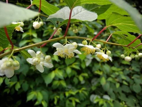 В пазухе листьев молодого растущего побега появляются мелкие белые бутоны, которые к началу июня увеличиваются в размерах и затем раскрываются. Цветение лиан происходит в течение 10-15 дней в середине июня. Каждый цветок имеет тонкую поникающую цветоножку, по 5 чашелистиков и лепестков. Диаметр цветка около 2 см. Лепестки овальной формы белые или с наружной стороны чуть розоватые с тонким приятным запахом. Внутри цветков мужских растений хорошо видны многочисленные тычинки на тонких нитях и желтой пыльцой в пыльниках. У женских растений внутри цветка в центре виден крупный пестик с расходящимися в виде лучей звезды столбиками.