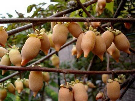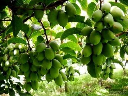 Actinidia “Weiki”. Плоды зеленые, иногда темно-коричневые при воздействии прямых солнечных лучей, около 4 см длиной. Ягоды, созревают в середине осени, но они не падают.