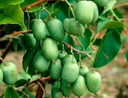 Актинидия “Киевская гибридная”. Плоды крупные, широкояйцевидные, массой 10-12 грамм, зеленого цвета, с бурыми крапинками, длиной 3,4 см, шириной 2,5 см. Вкус сладкий, мякоть нежная, зеленоватая, но вокруг семян красноватая. Сорт высокоурожайный, с лианы собирают 10-18 кг плодов.