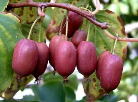 Actinidia “Ken’s Red”. Плоды большие, до 4 см длиной и 3 см в диаметре. Имеют пурпурно-красный оттенок на полном солнце и зеленые, когда находятся в тени. Созревают в середине осени. Не боятся мороза до -25°С.