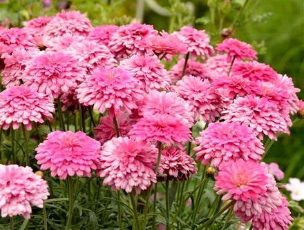 Цветы около 5 см диаметром самых разнообразных оттенков — белые, желтые, оранжевые, розовые или красные. Серединки собраны из трубчатых цветков, чаще желтого цвета. Есть махровые сорта. Цветение очень обильное в течение длительного периода — все лето и до середины осени.