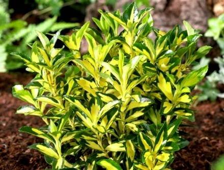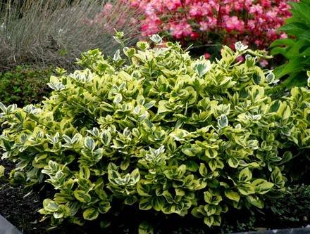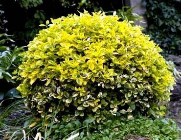 Euonymus “Aureo-Variegata”. (Аурео-Вариегата). Вечнозелёный стелющийся кустарник высотой до 30 см, шириной около 1,5 метров. Листья мелкие, блестящие, кожистые, светло-зеленые с неравномерным золотисто-пестрым краем.