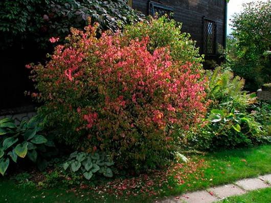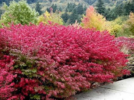 Euonymus “Dart’s Blanket”. (Дартс Бланкет). Кустарник с густыми побегами высотой до 1 метра, в ширину до 1,5 метров. Листья овальной формы, темно-зеленные, к осени становятся коричнево-красными или бронзовыми. Может скрыть стену или проволочную сетку.