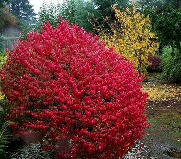 Euonymus “Red Cascade”. (Ред Каскад, Красный Каскад). Кустарник высотой до 3,5 и до 2,5 метров шириной. Листья зеленого цвета, яйцевидные, осенью окрашиваются в пурпурно-красный цвет. С сентября ветви усыпаны красными коробочками-плодами с ярко-оранжевыми семенами внутри. Морозоустойчивый.