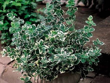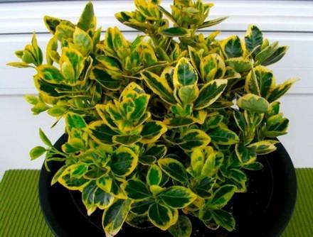 Бересклет японский (Euonymus japonicus). Это теплолюбивое растение не переносит сильных морозов, поэтому в морозных регионах выращивается только в домашних и оранжерейных условиях. Компактный хорошо облиственный ветвистый кустарник, высотой до 70 см. Листочки темно-зеленые, кожистые, до 8 см длиной, в форме вытянутого овала, по краю с мелкими зазубринами. Есть разновидности равномерно окрашенные и пёстролистные. В кистях соцветий по два-три десятка крошечных зеленовато-жёлтых цветочков. После цветения на растениях созревают кожистые коробочки оранжево-розового оттенка. Селекционерами выведено множество сортов с пестрыми листьями.