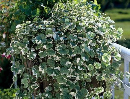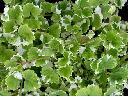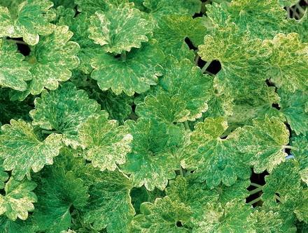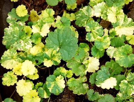 Glechoma Variegata — Будра вариегатная, пестролистная. (Variegated Ground Ivy, Creeping Charlie). Многолетнее травянистое растение до 15 см в высоту, формирует менее плотные, то красивые ковры. Стебли имеют много побегов, в длину растягиваются на 40 см. Листья ярко-изумрудные, сплошь покрытые беловатыми пятнами, есть белые каемки. Больше любит тепло и предпочитает яркое освещение. Если поместить ее в тени, то пестролистная листва теряет свою декоративность.