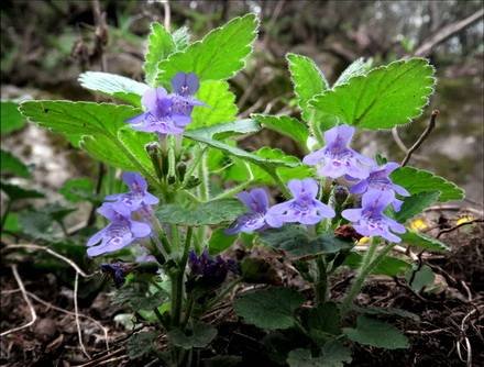 Glechoma hederacea — Будра плющевидная, стелющаяся. (Cat’s Foot, Alehoffs, Ground Ivy, Field Balm, Gill Over The Ground, Runaway Robin). (Собачья мята, Земляной плющ). Видовой эпитет плющевидная относится не столько к листьям будры, сколько к характеру ее роста. В благоприятных условиях она полностью захватывает подножие леса, скрывая под своим покровом мелкий валежник и даже упавшие стволы. Многолетнее травянистое растение с ползучим голым или с короткими волосками стеблем длиной 20-50 см, с многочисленными укореняющимися побегами. Образует низкие плотные коврики до 5-20 см высотой. Корни тонкие, мочковатые. Растение очень пахучее.