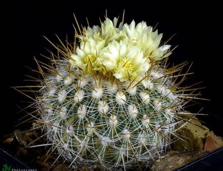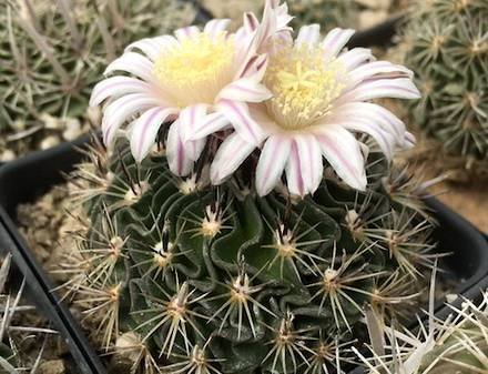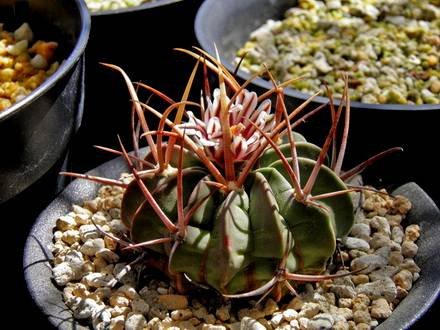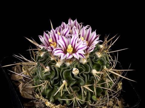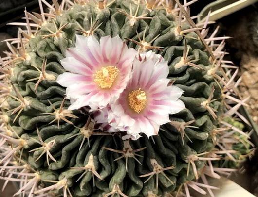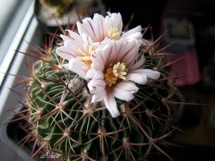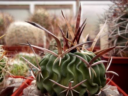 Радиальных колючек от 4-9, разной длины, желтоватые или коричневатые, 3 верхние до 3 см длиной, четырехгранные, отогнуты вверх, нижние округлые, короче верхних. Центральных колючек 2-4, верхние сплюснутые и широкие, длиной до 5 см. Цветки до 2,5 см длиной, желтовато-белые, с пурпурно-фиолетовой центральной полоской на лепестках, появляются на верхушке растения. Медленно растущий вид. В жаркую погоду вам может понадобиться поливать растения чаще, если оно активно растет. С конца сентября полив должен быть уменьшен, чтобы заставить перейти в состояние покоя, к октябрю вы должны перейти к зимнему режиму полива.