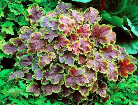 Heucherella “Solar Eclipse”. (Солар Эклипс, Солнечное затмение). Листья округлые, насыщенно-бордовые, окаймлены по краю нежно-салатовым кантом. Лучше всего ее сажать в таком месте, куда попадает утреннее солнце, так как в полной тени листья не будут так ярко окрашены.
