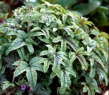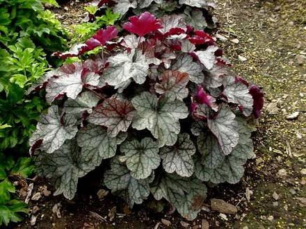 Heucherella “Plum Cascade”. Листья большие, серебристо-фиолетовые. Цветочки маленькие, светло-розовые. Можно использовать в качестве ампельного растения. Предпочитает полутень или тень.
