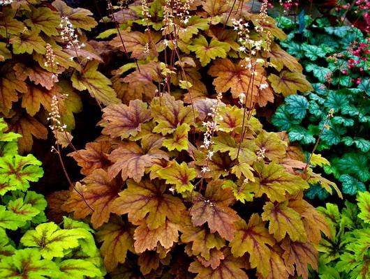 Heucherella “Redstone Falls”. Сорт терпим к солнышку, при достаточном его попадании становится более ярких, красных тонов. При меньшем попадании солнечного света на кустике появляются листочки разных оттенков: от зеленоватых до золотисто-желтых и оранжевых. Цветоносы длинные, с нежно-белыми цветами. Можно использовать в качестве ампельного растения.