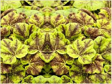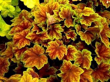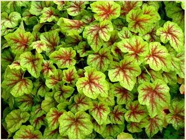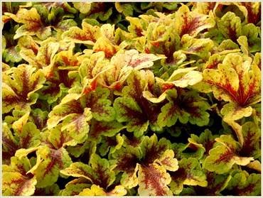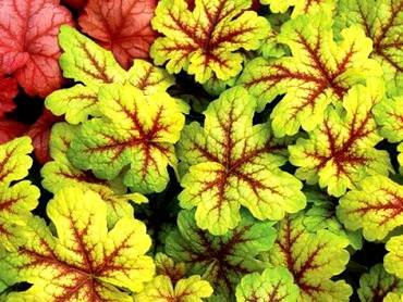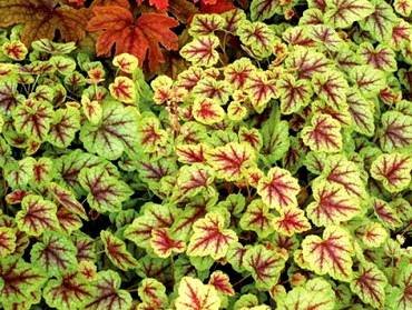 Heucherella “Alabama Sunrise”. (Алабама Санрайз, Закат Алабамы). Листья светло-зеленого, лимонного, золотистого и оранжевого цветов с красными прожилками. Их цвет меняется в зависимости от сезона и хорошо сочетается с желтыми цветами других декоративных растений. Цветет мелкими белыми цветами. Сажают в тенистых уголках сада.