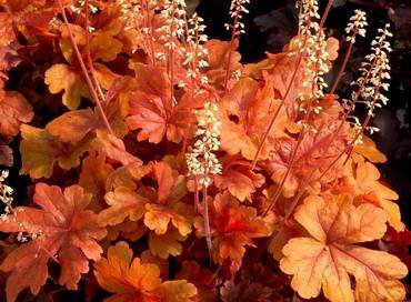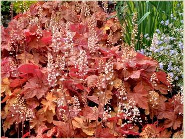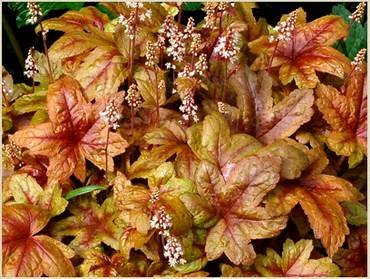 Heucherella “Autumn Cascade”. (Осенний каскад). Кустик в высоту достигает 15 см, а в ширину до 90 см. Листья небольшие, резные, имеют мягкие теплые оттенки: от кирпично-красного до желтовато-коричневого. На протяжении сезона меняется не кардинально. Цветет небольшими нежно-кремовыми колокольчиками. Наибольшей декоративности достигает в полутени, на солнышке будет подгорать. Отлично растет в висящих корзинах, очень эффектно смотрится в массовых посадках.