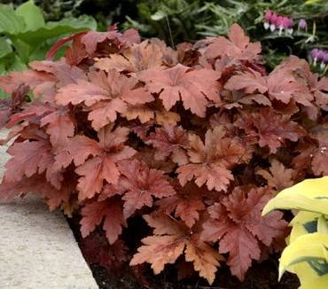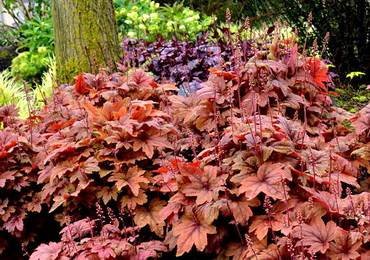 Heucherella “Burnished Bronze”. Глубоко прорезанные зелено-бордовые блестящие листья с бронзовым оттенком. Цветочки маленькие, мягкого розового цвета. Высаживают в тени деревьев.