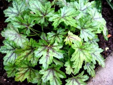 Heucherella “Kimono”. (Кимоно). Кустик высотой до 15 см. Удлиненные, пальмовидные, листочки бледно-зеленого оттенка раскрашены бордово-коричневыми прожилками, с серебряным отливом и темной контрастной центральной частью. Цветки розоватого цвета на длинных цветоносах.