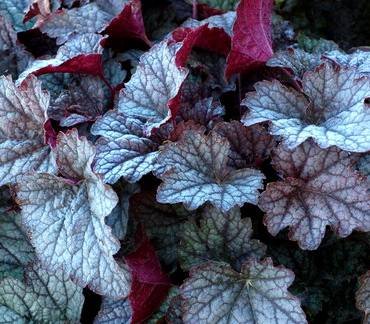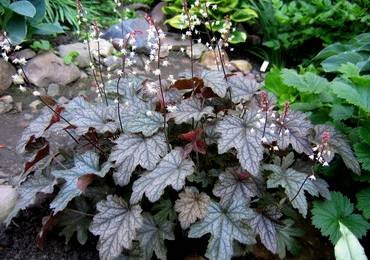 Heucherella “Twilight”. Куст высотой 25-30 см, нарастает в ширину до 60 см. Листья бархатистые, угольно-пепельного цвета с серебристым налетом и темным рисунком прожилок. Цветочки белые, в форме колокольчиков, на цветоносах до 40-60 см.