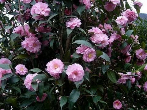 Camellia “Lady Campbell”. Сильно ветвящийся кустарник не более 2 метров в высоту. Цветки, похожие на пионы, могут иметь размер до 10 см в диаметре.