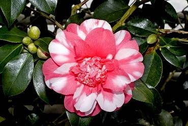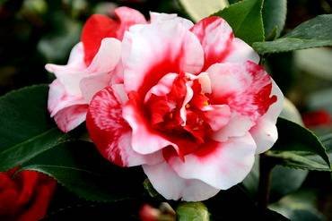Camellia japonica — Камелия японская, японика. (Japanese Camellia, Peony Camellia, Thea Japonica). Теневыносливые вечнозеленые рослые деревья или кустарники усыпанные цветками. В природе может достигать обычно 1,5-6 метров в высоту. Самые молодые ветви пурпурно-коричневые, с возрастом становятся серовато-коричневыми. Листья очередные, кожистые, глянцевые, темно-зеленые, более светлые на нижней стороне, яйцевидной или эллиптической формы, заостренные, длиной до 10 см. Края листьев пильчатые, острые могут поранить кожу.