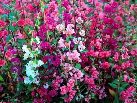 Clarkia “Bouquetmixed”. Пушистые махровые полусферы, сидящие по всей высоте стебля почти друг напротив друга. Лепестки окрашены в оттенки розового и белого.