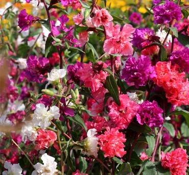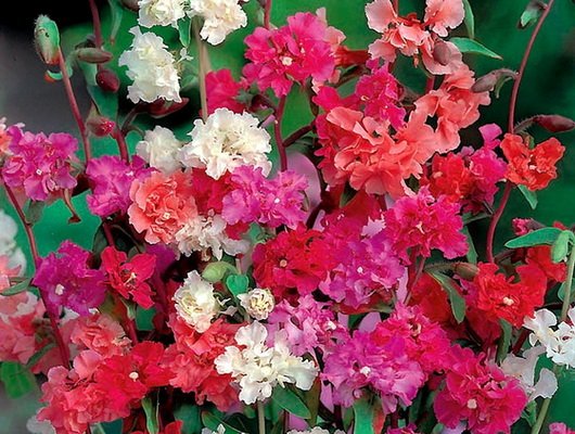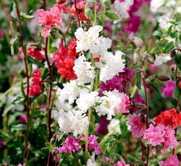 Кларкия “Махровая”. Средняя высота густоветвистого куста 30-65 (90) см. Цветки махровые, около 5-6 см в диаметре, с различными оттенками от белоснежного до насыщенного карминового, обрамляют стебли так, что создается образ колосовидного растения.