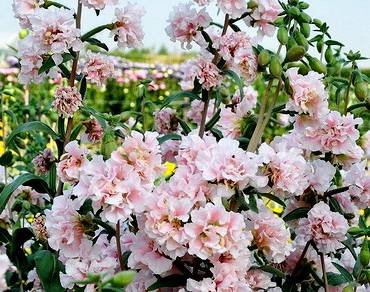 Clarkia “Sakura”. Сакура. Махровые соцветия персиковой окраски, густо расположены на высоком ветвистом стебле.