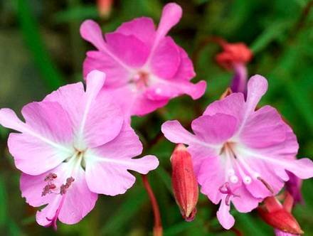 Clarkia “Pink Ribbons”. Растения высотой до 30 см, стебли ветвистые. Цветки розовые, лепестки узкие, напоминают ленты. Цветение обильное.