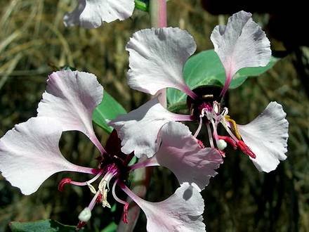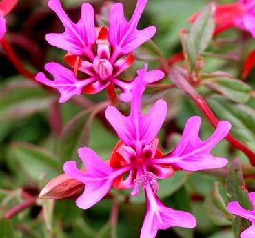 Clarkia pulchella — Кларкия хорошенькая, опушенная, пульчелла. (Pinkfairies, Deerhorn Clarkia, Beautiful Clarkia, Ragged Robin Clarkia, Ragged Robin). Растение однолетнее, часто карликовое или розеточное. Стебли прямостоячие, ветвистые, 20-40 см высотой, покрытые тонкими прижатыми волосками. Листья сидячие, чередующиеся, зеленого цвета, от линейно-ланцетных до лопатчатых, цельнозубчатые, узкие, цельные, заостренные к вершине и суженные к черешку, 2-7 см длинной и 2-10 мм. шириной. Цветки простые или махровые от лавандовых до розово-пурпурных, до 3 см в диаметре, одиночные или собранные по несколько штук в пазухах листьев на верхушках побегов. Оригинальна форма волнистых лепестков, разделенных на три широко расставленные доли и парой загнутых назад зубцов на ноготках, Каждая доля, в свою очередь, трехлепестковая, причем средняя доля наиболее широкая. Зацветает на две недели раньше кларкии изящной.