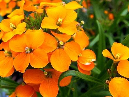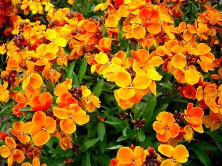 Erysimum allionii — Лакфиоль Аллиона. (Siberian Wallflower, Сибирский моллюск). Erysimum marschallianum, Cheiranthus allionii. Вечнозеленый многолетник с зелеными копьевидными листьями. Кусты высотой 30-50 см. Соцветия крупные, насыщенно-желтого оттенка. Выращивают также как летник или двулетник.