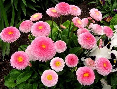 Bellis “Pomponette”. (Помпонетт). Высотой 10-15 см. Миниатюрная помпонная маргаритка с соцветиями диаметром 2 см, похожими на пуговицы. Соцветия махровые, розовые, белые или красные.