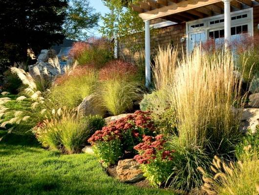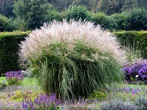 Это могут быть многолетники – астильбы, вербейник, георгины, лилейник, люпин, платикодон, розы, тысячелистник, флоксы, другие злаковые растения. Мискантусы заметно оживляют хвойные сады, эффектно контрастируя с вечнозелеными растениями. Но особое предпочтение следует отдать поздноцветущим растениям, таким как многолетняя астра, рудбекия, солидаго, хризантемы, седум видный, нивяник. Зимой и летом великолепно их сочетание со стриженными кустарниками в шаровидной форме.