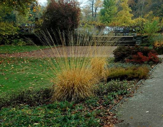 Molinia “Strahlenquelle”. Светлые, почти белые стебли этого сорта имеют форму дуги. Такая “плакучая” форма побегов делает его прекрасным украшением участка.