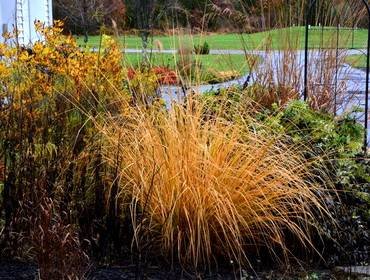 Molinia “Karl Foerster”. (Карл Форстер). Раскидистый куст с серо-зеленой листвой и широкими выгнутыми коричневыми метелками, высотой до 2 метров. Его тянущиеся ввысь и немного погнутые листья эффектно серебрятся. Любит и солнце, и тень, может сильно разрастись. При цветении окраска листвы становится более мягкой, в другое время цвет меняется от глубокого зеленого до коричневого и соломенного.
