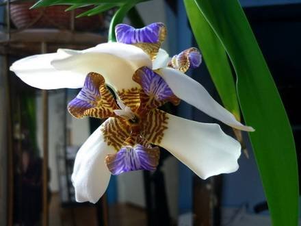 Neomarica gracilis — Неомарика изящная, стройная. (Apostle Plant, Apostle’s Iris, Walking Iris). Имеет расположенные веером листья мечевидной формы, глянцевые, зеленые, длиной от 40 до 60 см, шириной 4-5 см, растут от основания растения. На одном цветоносе может образовываться 6-10 цветков, которые раскрываются постепенно. Цветок состоит из трех больших горизонтальных лепестков, образующих ореол вокруг трех меньших, загнутых лепестков. Шесть лепестков расположены в два ряда. Наружные лепестки крупнее внутренних. Цветки ароматные, имеют белые внешние лепестки с коричневыми пятнами в центре и синие внутренние лепестки с желтыми и коричневыми оттенками. Цветок начинает открываться утром, днем полностью раскрывается, к вечеру увядает. Произрастает преимущественно на нейтральных почвах. Все части растения ядовиты при попадании внутрь.