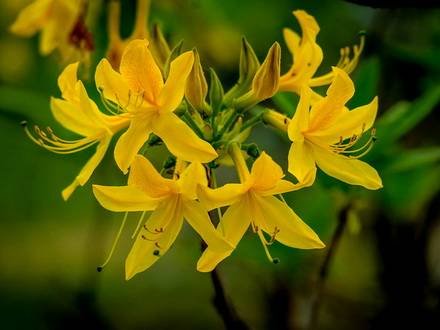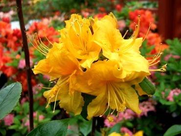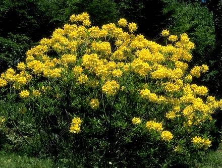 Rhododendron luteum — Рододендрон желтый. (Yellow Azalea, Honeysuckle Azalea, Pontiac Azalea). Листопадный прямостоячий раскидистый кустарник высотой до 3 метров. Листья продолговатые, длиной 5-10 см и шириной 2-4 см. Осенью становятся желтыми, оранжевыми и пурпурно-красными. Цветет весной ярко-желтыми ароматными цветками, собранными в связки по 7-17 штук, до распускания листьев или одновременно с ними.