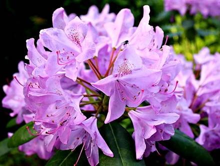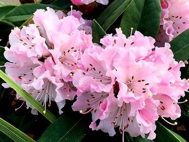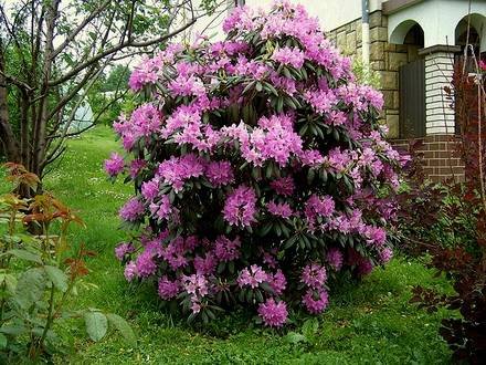 Rododendron “Roseum Elegans”. (Розеум Элеганс). Вечнозеленый раскидистый, ветвистый и полушаровидный кустарник высотой взрослого до 2-3 метров, шириной 1,5-2,5 метра. Растет медленно. Листья эллиптические, 6-8 см длинной, при распускании красновато-коричневые, затем темно-зеленые. Цветки до 7 см, нежно-розового цвета с красновато-коричневой пятнышком, слегка волнистые по краям и собраны по 15 штук в соцветия. Цветет с начала июня.