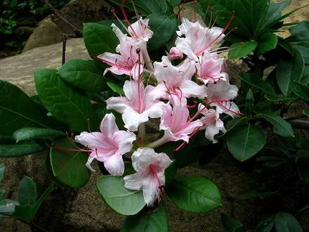 Rhododendron poukhanense — Рододендрон пукханский. (Korean Azalea). Вечнозеленый раскидистый кустарник от 60 см до 1 метра высотой. Крону формирует распростерто, но компактно. Листья продолговато-ланцетной формы, темно-зеленого цвета, опушенные, осенью приобретают оранжево-красные тона. Цветки сидячие, розовато-фиолетового цвета с коричневыми крапинками, до 5 см в диаметре, широковоронковидной формы, слегка ароматные, собраны по 2-3 штуки на концах побегов. Цветки распускаются в мае-июне вместе с листьями. Вид очень медленно нарастает, его годовой прирост составляет около 2 см. Растение светолюбиво, зимостойко, но рекомендуется легкое укрытие в зимний период, растет на слабокислых почвах. Прекрасный вид для украшения альпинариев и композиций с камнями.